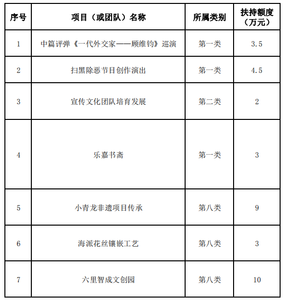 索引号: 00001434-9/2019-00153 发布机构: 菊园新区 发文日期: 2019年09月24日 主题分类: 政务公告 关键词: 关于2019年度菊园新区文化发展资金扶持项目的公示 来源:菊园新区 发布时间:2019-09-24 浏览次数: 次 【字体:小 大】 根据《菊园新区文化发展资金管理办法》的工作要求,经菊园新区文化发展资金审核办公室及评审专家委员会评议决定,现拟对以下项目(第一类、第二类、第四类、第八类)进行扶持:即日起公示7天(2019年9月24日-2019年9月30日),如有异议请致电菊园新区宣传科:39986628。 菊园新区文化发展资金审核办公室2019年9月24日 分享到: