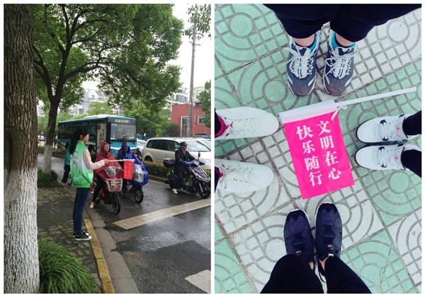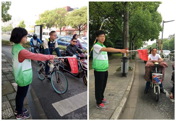 工作中看到非机动车压线了,同学们会礼貌的跟车主说,为了您的安全请不要压线。看到行人在斑马线上等绿灯,同学们耐心劝阻让其退到上街沿等候。学生志愿者的劝导,弥补了交警执法的人手紧缺,市民更容易接受。